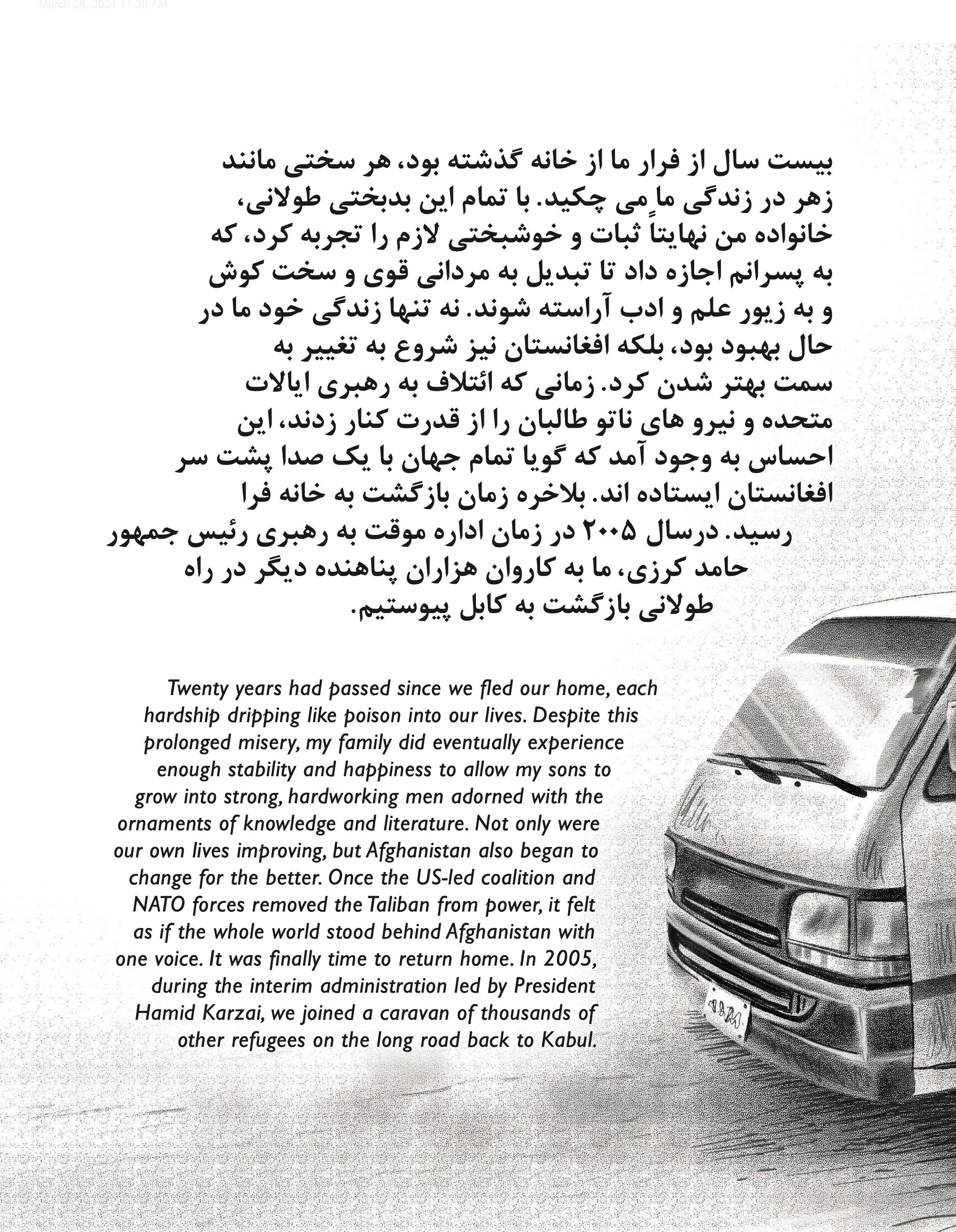 This story recounts the engagement of a young Persian woman in Afghanistan, and then the painful losses she endures as she flees the Taliban and then, ultimately, her homeland.