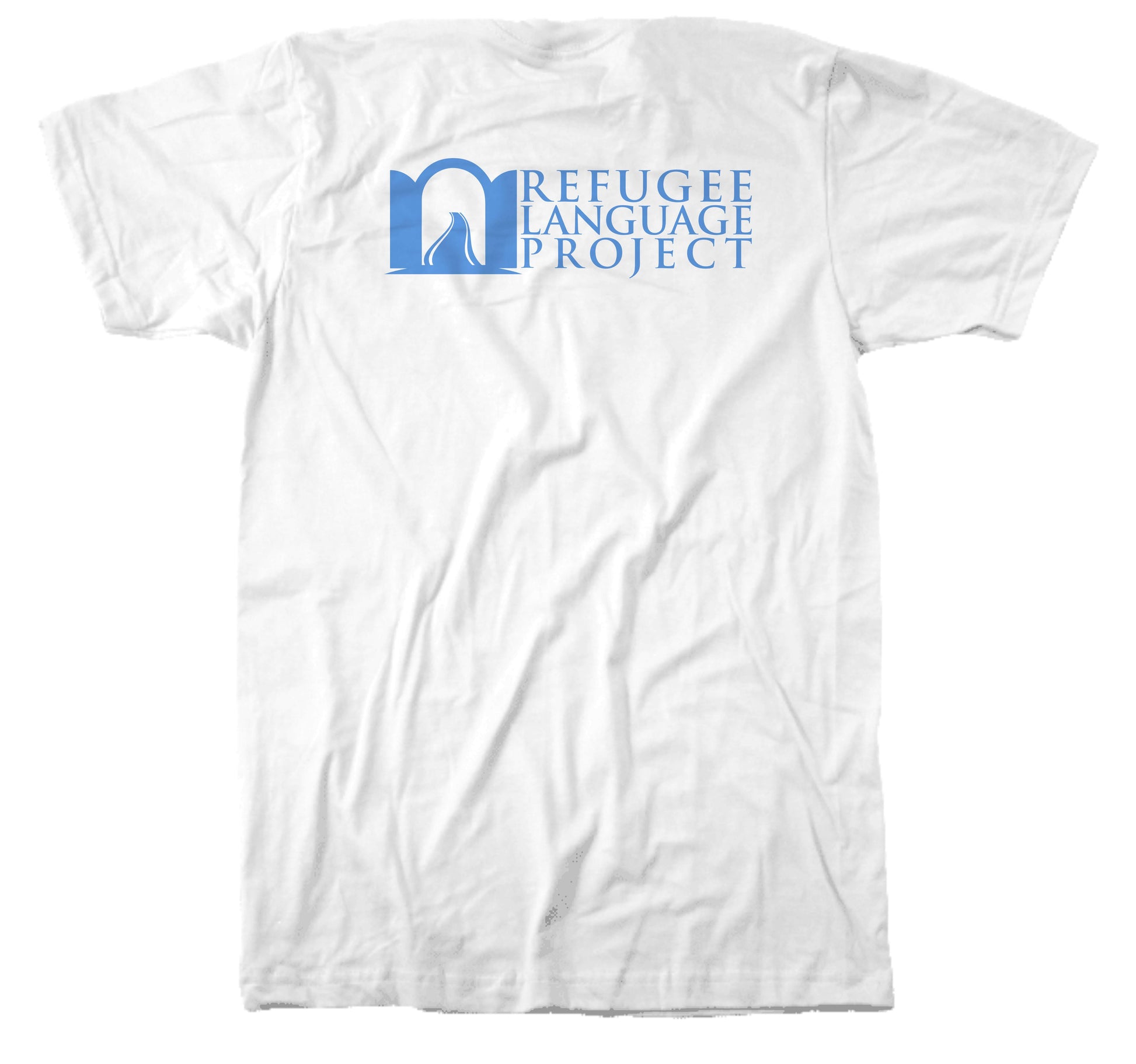 This white District t-shirt celebrates Refugee Language Project's "Taste the World" global food event. The back shows the Refugee Language Project logo.